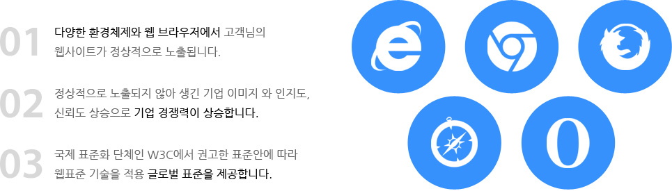 ICT의 급속한 발전과 혁신으로 다양한 환경체제(디바이스, 브라우저)를 통해 웹사이트에 접근이 가능해졌고 이로인하여 기존의 경직된 웹 환경을 넘어 환경에 제약없이 홈페이지를 통한 홍보 및 마케팅 추진할 수 있으며 기업 이미지와 경쟁력 제고에도 필수적인 표준 전략으로 자리매김 하였습니다.